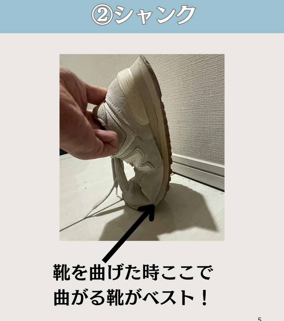 安定性は踵の芯がしっかりと入っている靴です。分かりやすく言えば、本来の足の動きが合った靴です。もっと分かりやすく言えば、つま先だけが曲がり、土踏まずと踵は芯を使うことで、曲がらないようになっています。これが本来の足の動きに合わせた、足に優しい靴です。